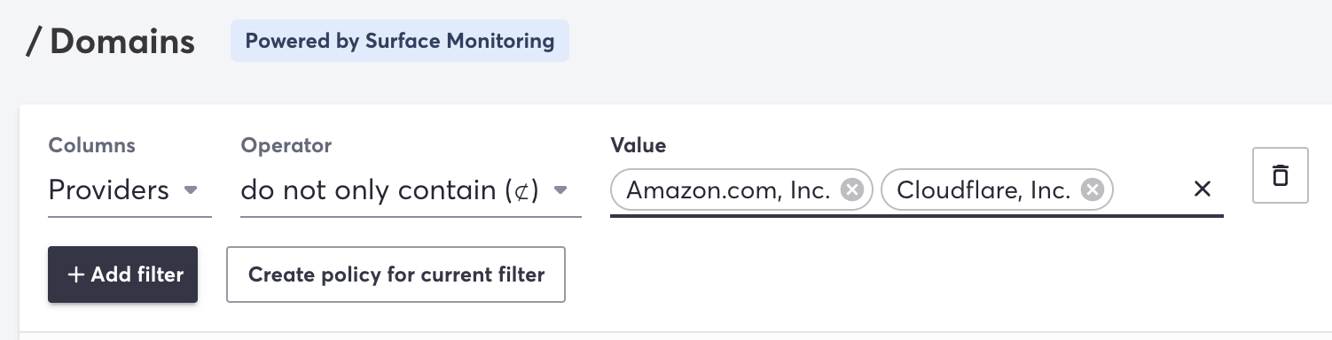 If your organization is supposed to have all assets (or even certain subscopes) behind Cloudflare, a policy can be set up using the Providers column together with the operator do not contain all of or the operator do not contain any of since these do the same when there is only one item the list of values. Subscopes can then be used using any of the other columns, such as the Monitored domain name, country, etc. If a domain in scope is found to use something other than Cloudflare, this will create a policy breach to be investigated and followed up.